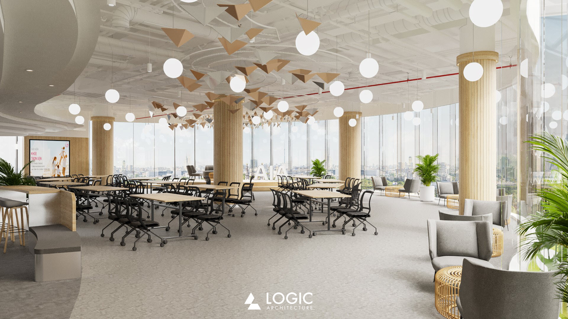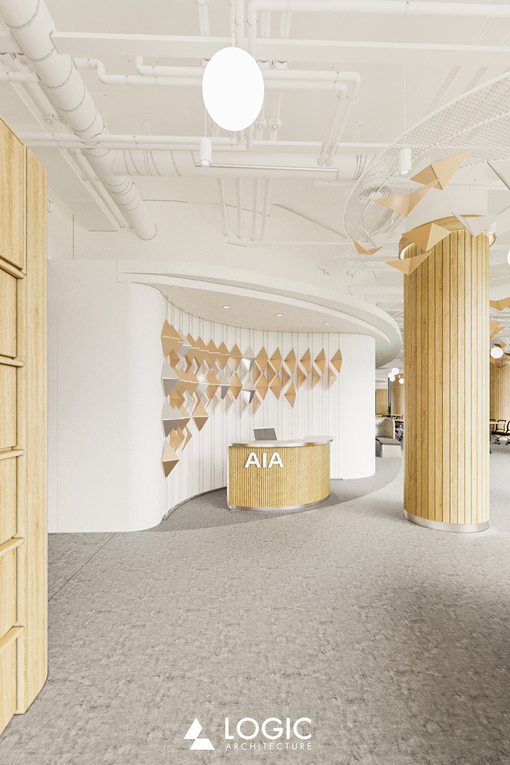 AIA Da Nang is one of AIA’s primary office in Vietnam. The renovation will incorporate the gold color, inspired by the iconic Dragon bridge image of Da Nang. The renovation features dragon scales on the walls and ceiling, leading the traffic flow from the lobby to the main stage which has the best panorama bridge landscape as its background.